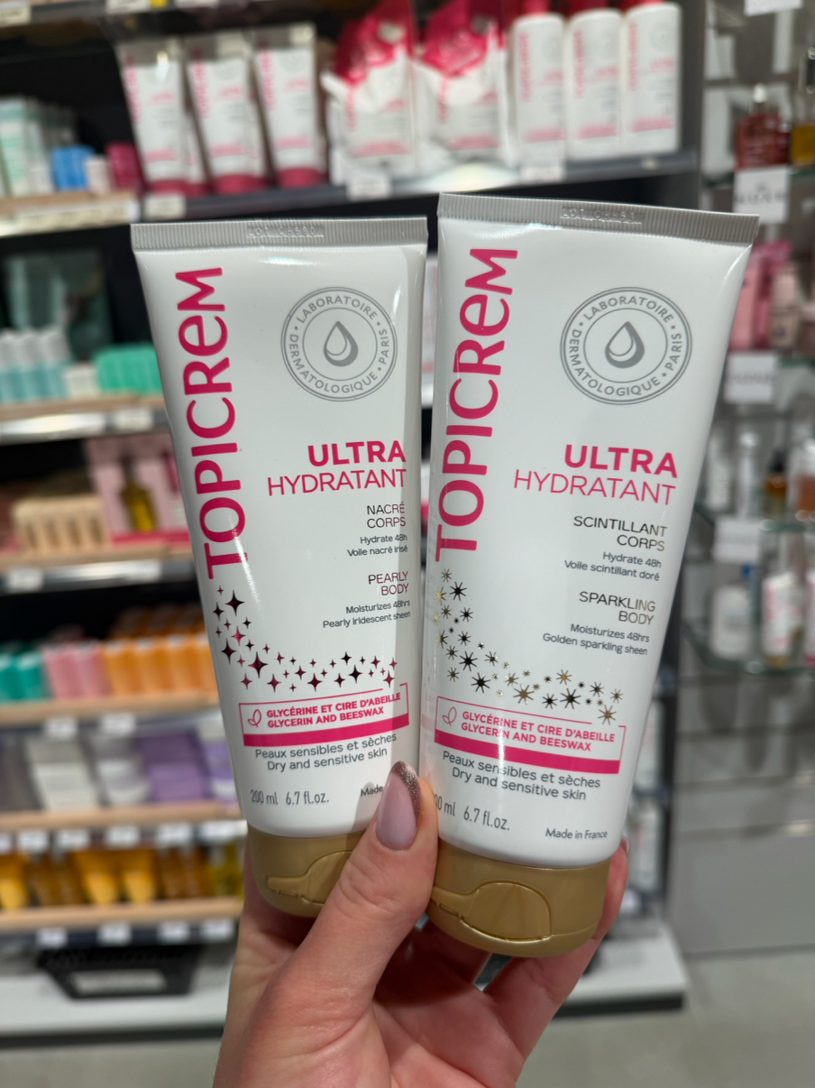 Pour briller lors des réveillons, misez sur le duo TOPICREM Ultra-Hydratant Nacré & Scintillant 💫